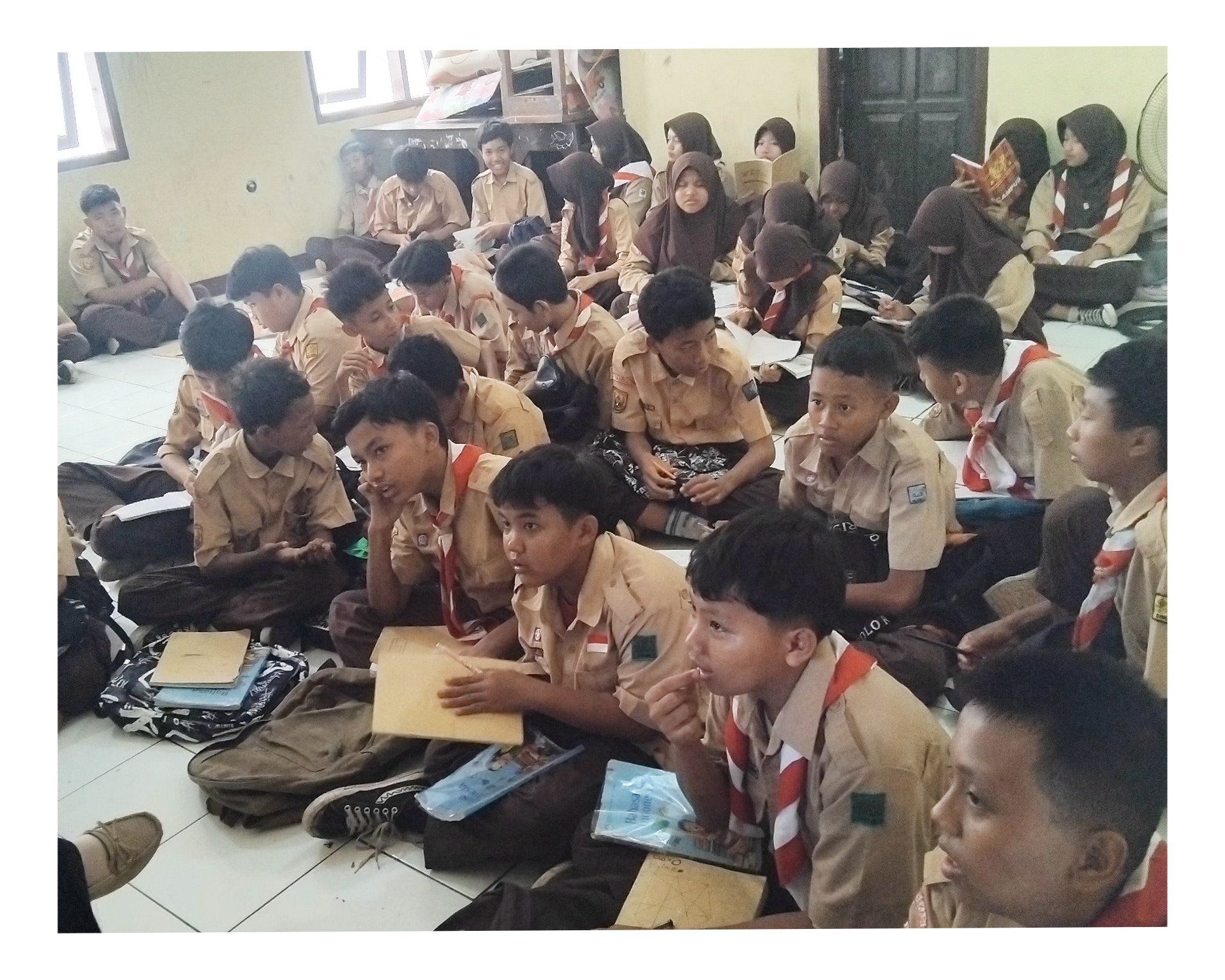 Sejumlah pelajar di USB SMP 62 Kota Bekasi harus menjalani proses belajar sambil duduk di lantai. Hal ini terjadi karena sekolah tersebut belum mendapat pengadaan meja dan kursi dari Dinas Pendidikan Kota Bekasi.