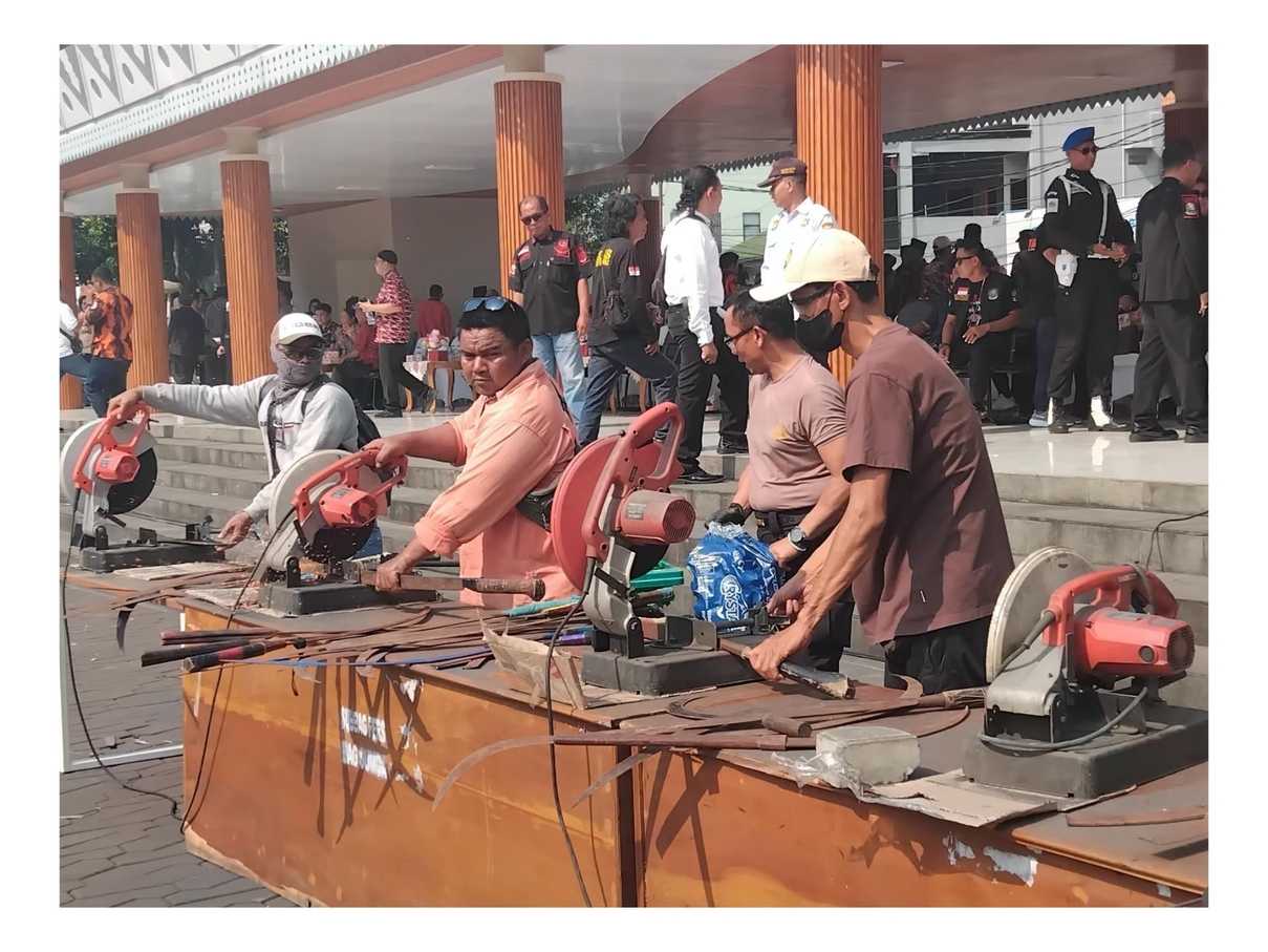 Polres Metro Bekasi Kota memusnahkan ratusan senjata tajam hasil penindakan kasus tindak pidana pencurian dengan kekerasan dan tawuran di Lapangan Alun-alun M. Hasibuan, Marga Jaya, Bekasi Selatan, Kota Bekasi pada Jumat 10 Oktober 2025.