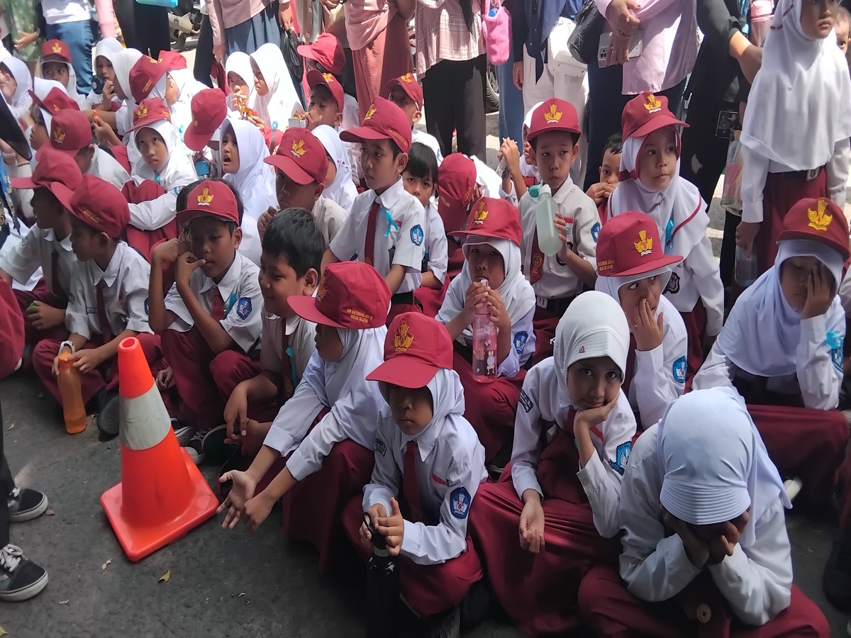 Ratusan siswa SD bersiap menyambut kedatangan Presiden Republik Indonesia Prabowo Subianto di SMPN 4 Kota Bekasi, Jalan Komodo Raya, Perumnas 1, Bekasi Selatan, Kota Bekasi, Senin 17 November 2025 pagi.