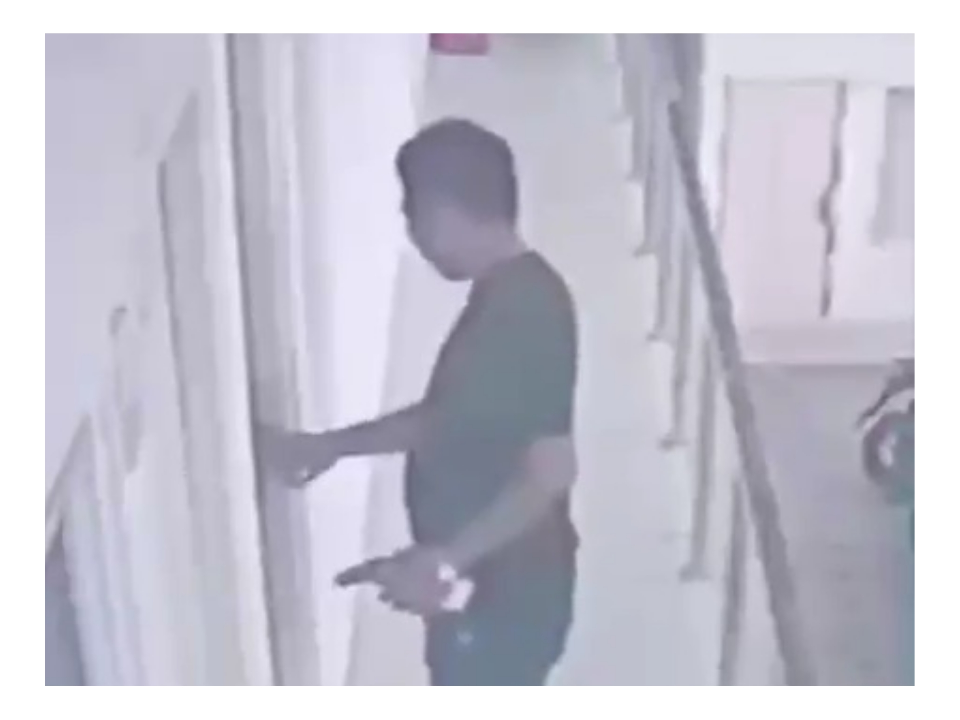 Berdasarkan rekaman CCTV, terlihat seorang pria mengenakan kaos dan celana pendek hitam, serta sandal putih. Pria tersebut tampak membawa sebotol cairan pembersih lantai dan masuk ke kamar korban menggunakan kunci yang dibawanya sendiri.