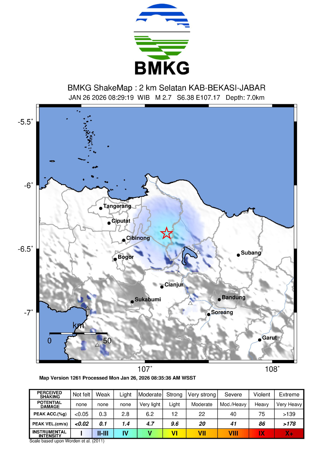 Gempabumi tektonik berkekuatan magnitudo 2,7 mengguncang wilayah Kabupaten Bekasi dan sekitarnya, Senin 26 Januari 2026.