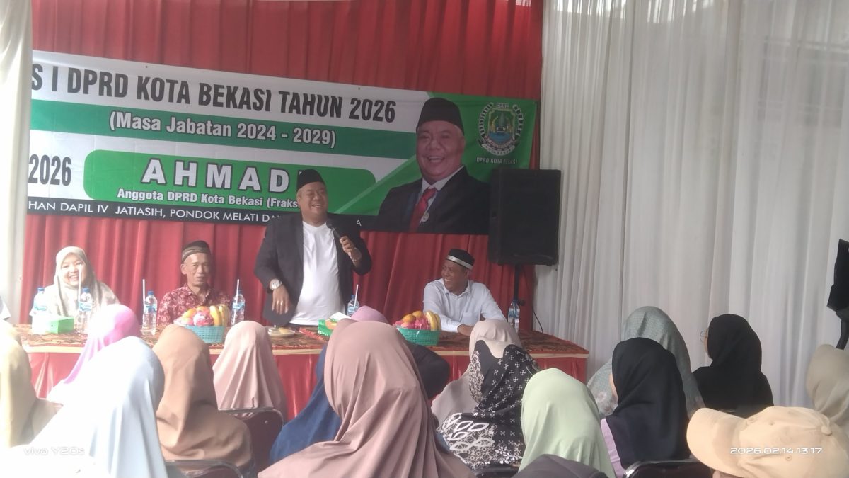 Ahmadi, Anggota DPRD Kota Bekasi Fraksi PKB, menggelar Reses I Tahun 2026 di RT 002 RW 012, kelurahan Jatimekar, kecamatan Jatiasih, Sabtu (14/2/2026). Kegiatan tersebut menjadi agenda penyerapan aspirasi warga Daerah Pemilihan (Dapil) IV yang meliputi Jatiasih, Pondok Melati, dan Jatisampurna.