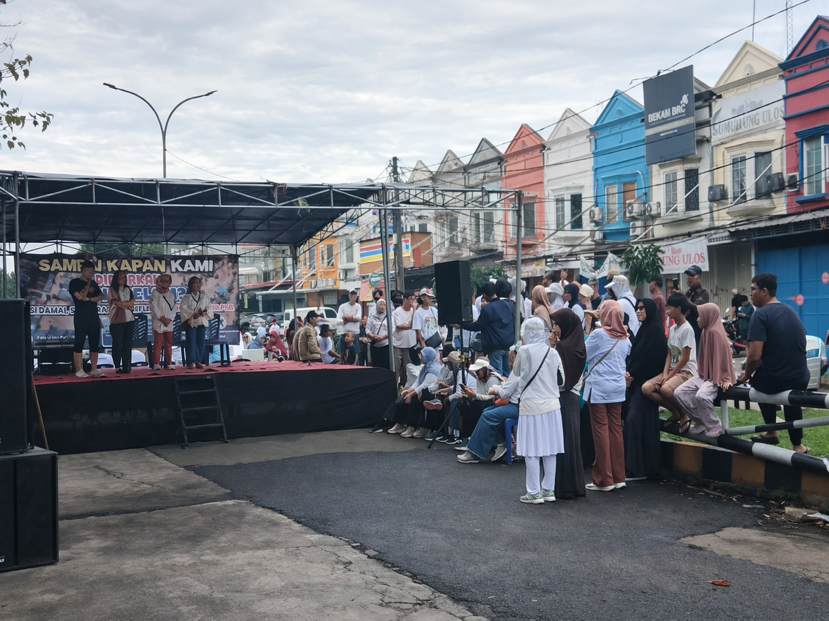 Warga Perumahan Pondok Mitra Lestari, Kota Bekasi, menggelar aksi damai menuntut pemerintah segera menyelesaikan pembangunan tanggul yang belum rampung, menyusul banjir berulang yang telah merendam permukiman mereka selama bertahun-tahun, Minggu 15 Februari 2026.